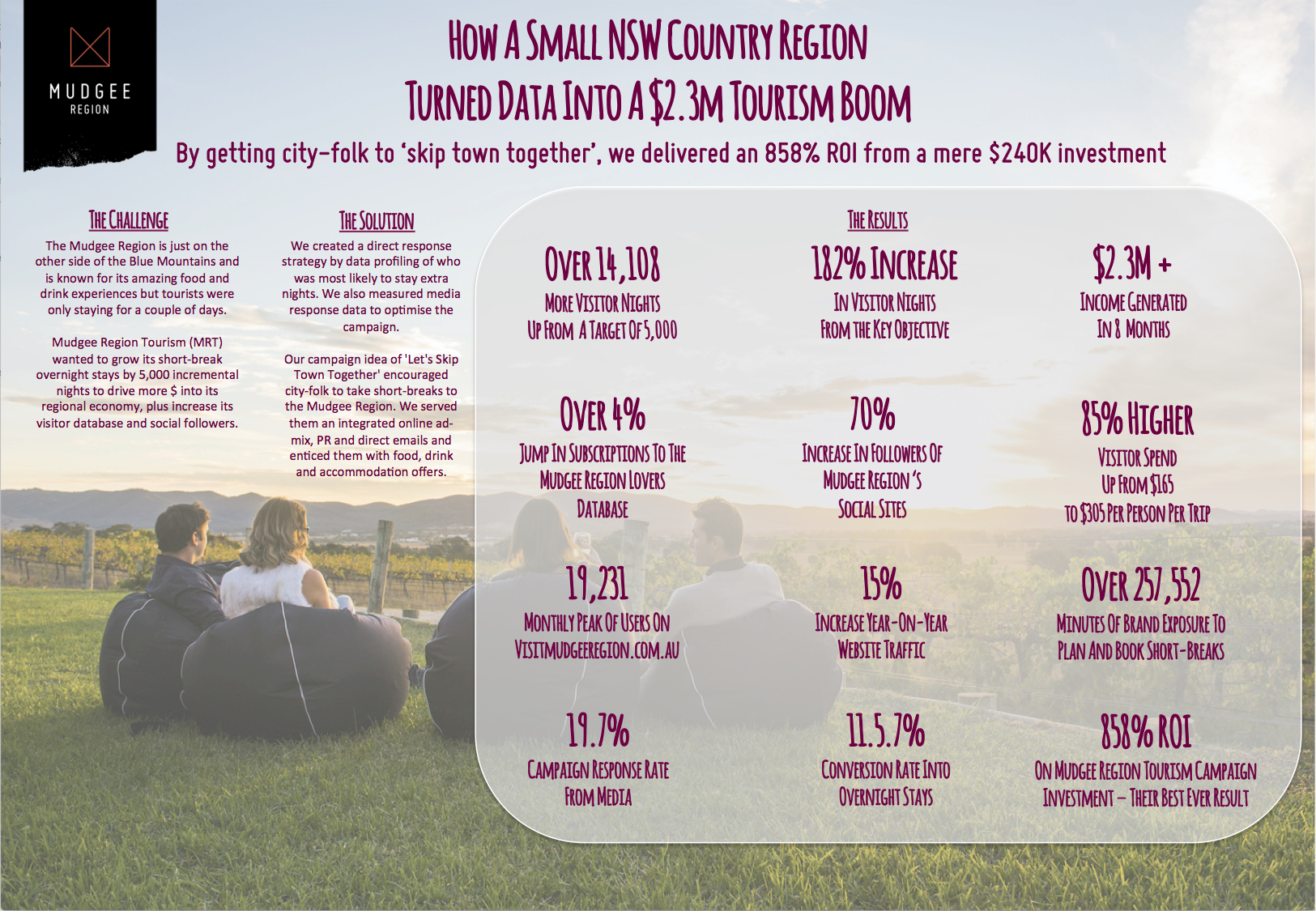 The Mudgee Region in NSW is known for its amazing food and drink experiences but tourists were only staying for weekends. Partnering with DMS, Fred&Co created a mid-week visitation campaign that smashed its set objectives by 182% and boosted the average tourist spend by 85% to $305 per person, creating a $2.3million tourism boom from a $240K investment – all by suggesting to people to ‘Skip town together to the Mudgee Region’ mid-week. Fred&Co teamed up with Destination Store and Leonards Advertising Media to deliver the campaign. Watch the video to see how we did it.